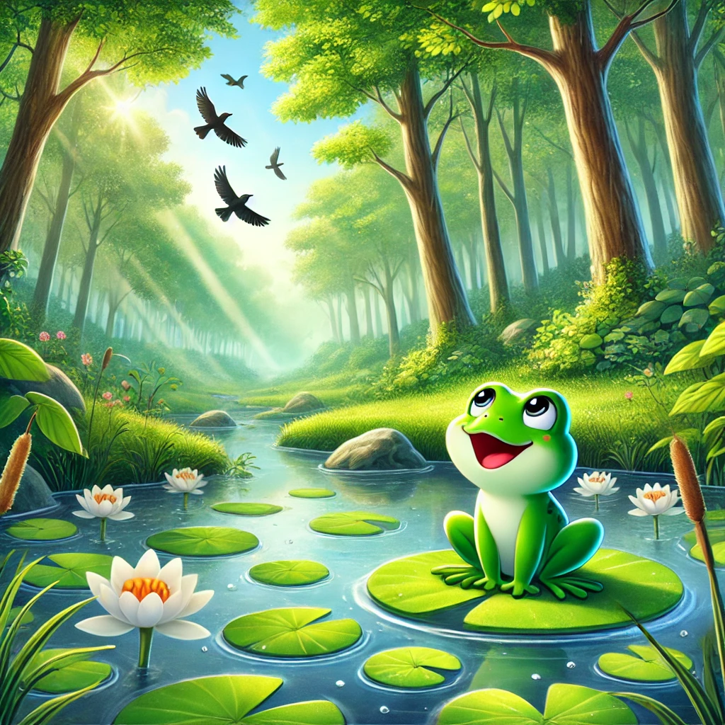 Era uma vez, em uma floresta verdejante, vivia um pequeno sapo chamado Fred. Fred era um sapo alegre que adorava pular nos lírios do lago e brincar na água com seus amigos. Mas Fred tinha um grande sonho—ele queria voar como os pássaros que ele via no céu.